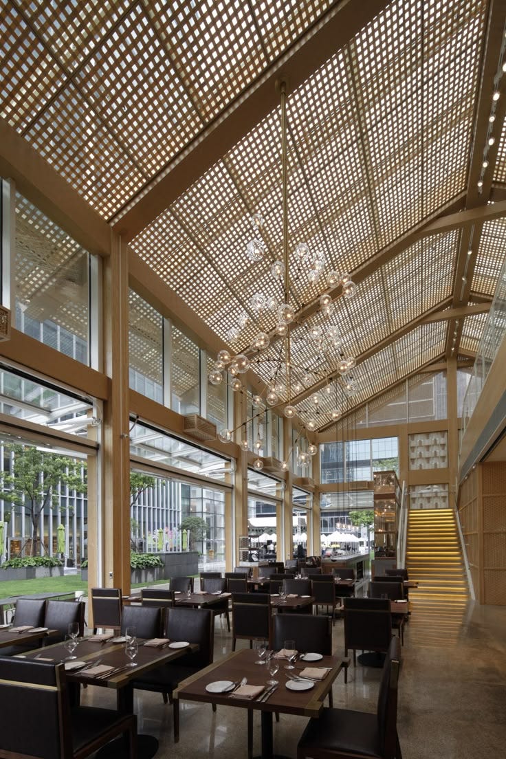 - Layered wooden planks with concealed LED lighting = chef’s kiss